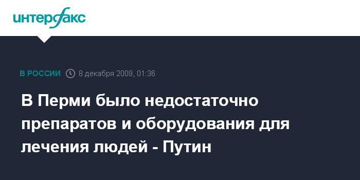 Пермь. 8 декабря. ИНТЕРФАКС - В медучреждениях Пермского края было недостаточно препаратов и оборудования для лечения людей даже в обычных условиях, заявил премьер-министр Владимир Путин.