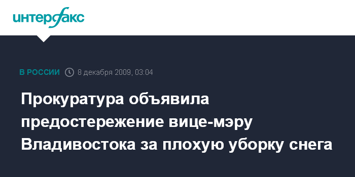Владивосток. 8 декабря. ИНТЕРФАКС-ДАЛЬНИЙ ВОСТОК - Прокуратура Владивостока, проведя проверку работы мэрии по ликвидации последствий снегопада, пришла к выводу, что уборка города была проведена плохо.