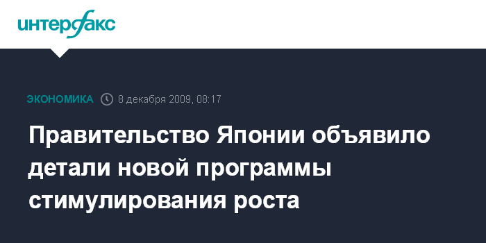 Москва. 8 декабря. INTERFAX.RU - Правительство Японии обнародовало во вторник новые меры по поддержке экономики, которые включают в себя программы по поддержке регионов, стимулированию занятости и реализации экологических мероприятий на общую сумму в 7,2 трлн иен ($81 млрд), сообщило агентство Bloomberg.
