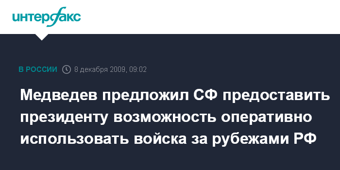 Москва. 8 декабря. INTERFAX.RU - Дмитрий Медведев внес в Совет Федерации предложение о предоставлении президенту России возможности в целях защиты интересов государства и его граждан, поддержания международного мира и безопасности принимать решения об оперативном использовании за пределами территории страны формирований вооруженных сил в соответствии с общепризнанными принципами и нормами международного права, международными договорами страны и названным федеральным законом.