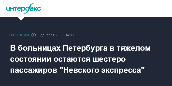 Санкт-Петербург. 8 декабря. INTERFAX.RU - В клиниках Петербурга на 8 декабря в тяжелом состоянии находятся шесть пострадавших при крушении "Невского экспресса", сообщила губернатор северной столицы Валентина Матвиенко журналистам во вторник.