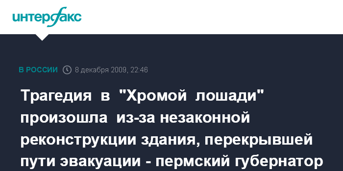 Трагедия в "Хромой лошади" произошла из-за незаконной реконструкции здания, перекрывшей пути эвакуации - пермский губернатор