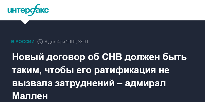 "Стороны очень интенсивно работают на переговорах в Женеве, обсуждается подсчет носителей и зарядов, имеющихся у обеих сторон. Мы хотим добиться такого договора, который бы легко поддавался ратификации. Мы ожидаем дальнейшей совместной работы с российской стороной", - сказал адмирал Маллен иностранным журналистам в Вашингтоне.