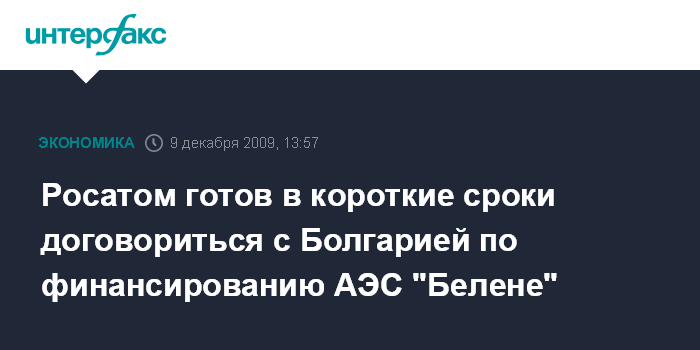 Москва. 9 декабря. INTERFAX.RU - Госкорпорация "Росатом" готова в короткие сроки договориться с Болгарией по финансированию АЭС "Белене", сообщил глава "Росатома" Сергей Кириенко премьер-министру РФ Владимиру Путину в ходе встречи в среду. "Мы сейчас подготовили в соответствии с вашим поручением новое предложение для правительства Болгарии. Там главный вопрос сейчас - это источники финансирования. Проект полностью согласован. И если вы одобрите, мы сможем достаточно быстро - 10-11 декабря там межправительственная комиссия, - попробуем, пользуясь этой возможностью, договориться", - сказал он.