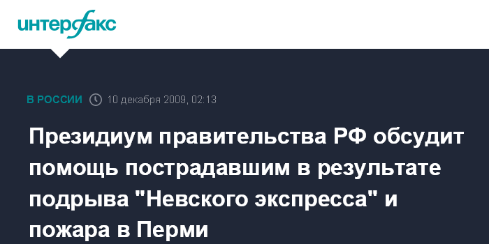 Москва. 10 декабря. ИНТЕРФАКС - Президиум правительства в четверг рассмотрит вопрос об оказании помощи семьям погибших и пострадавшим в крушении поезда "Невский экспресс", а также в результате пожара в Перми.