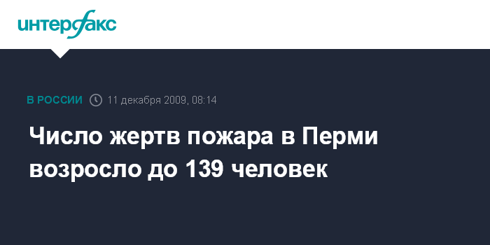 Москва. 11 декабря. INTERFAX.RU - Пресс-служба ГУ МЧС России по Пермскому краю сообщает об увеличении количества погибших в результате пожара в ночном клубе в Перми. "По состоянию на 08.00 часов 11 декабря 2009 г. на пожаре в кафе "Хромая лошадь" погибло 139 человек, 91 человек пострадавших находятся в больницах", - говорится в сообщении.