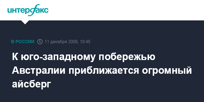 Москва. 11 декабря. INTERFAX.RU - Власти Австралии оповестили суда, находящиеся у юго-западного побережья страны, об опасности, связанной с приближением гигантского айсберга. Размеры айсберга составляют 140 кв. километров. Ледяная глыба находится примерно в 1,7 тыс. километров от берегов Австралии.