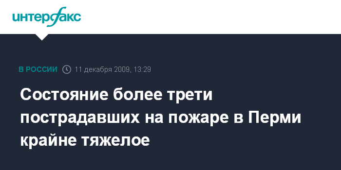 Москва. 11 декабря. INTERFAX.RU - По последним данным Минздравсоцразвития, из 89 пострадавших, находящихся в стационарах Москвы, Санкт-Петербурга, Челябинска и Перми в результате пожара в пермской клубе "Хромая лошадь", более трети находится в крайне тяжелом состоянии.