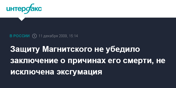 Москва. 11 декабря. INTERFAX.RU - Защита скончавшегося в больнице СИЗО юриста фонда Hermitage Capital Group Сергея Магнитского не исключает обращения с требованием эксгумировать тело покойного для проведения дополнительной экспертизы причин его смерти.