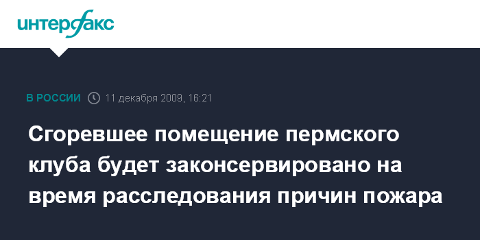 Москва. 11 декабря. INTERFAX.RU - Следствие постановило законсервировать помещение клуба "Хромая лошадь" в Перми на период расследования уголовного дела о пожаре. "На основании постановления следователя принимаются меры консервации помещения, в котором располагался клуб "Хромая лошадь". Вопрос о возможности его дальнейшего использования будет решен только после проведения всех необходимых комплексных экспертиз", - сообщает СУ СКП РФ по Пермскому краю.