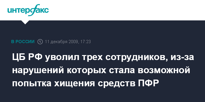 Москва. 11 декабря. INTERFAX.RU - Руководство ЦБ РФ решило уволить трех сотрудников Первого операционного управления, виновных в нарушении нормативных актов ЦБ, что сделало возможной попытку хищения средств Пенсионного фонда России (ПФР) со счетов ЦБ.