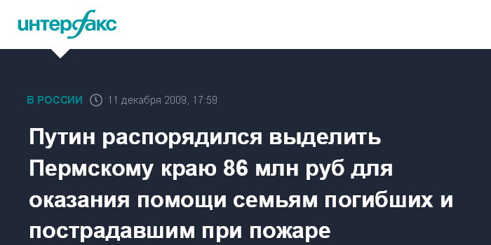 В соответствии с распоряжением, бюджету Пермского края будет оказана финансовая помощь за счет предоставления в 2009 году из федерального бюджета дотации на поддержку мер по обеспечению сбалансированности бюджета Пермского края в размере 86 млн рублей для оказания единовременной материальной помощи семьям граждан, погибших (умерших), а также гражданам, пострадавшим в результате пожара.