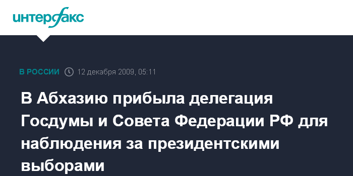 Сухуми. 12 декабря. ИНТЕРФАКС - В Абхазию прибыла делегация Госдумы РФ и Совета Федерации, для наблюдения за выборами президента республики.