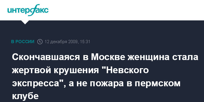 Скончавшаяся в Москве женщина стала жертвой крушения "Невского экспресса", а не пожара в пермском клубе