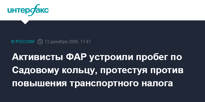 Москва. 12 декабря. INTERFAX.RU - Около 200 активистов Федерации автовладельцев России (ФАР) в субботу участвуют на своих машинах в автопробеге в знак протеста против повышения транспортного налога в Москве, сообщил лидер московского отделения ФАР Сергей Канаев.