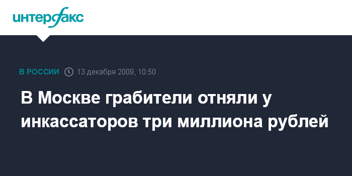Москва. 13 декабря. INTERFAX.RU - Разбойное нападение на инкассаторов совершено утром в воскресенье в Москве, похищено около 3 млн рублей, сообщил "Интерфаксу" источник в правоохранительных органах города. "Нападение произошло около 09:30 на востоке Москвы. Трое неизвестных заблокировали автомобиль "Рено", в котором находились инкассаторы, и отняли сумки, в которых находилось приблизительно 3 млн рублей", - рассказал собеседник агентства. Он добавил, что грабители скрылись на автомобиле ВАЗ белого цвета. В настоящее время в городе введен план "Перехват". Нападение совершено по адресу Окружной проезд, дом 6, пострадавших нет.