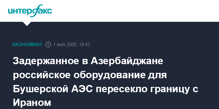 Баку. 1 мая. ИНТЕРФАКС-АЗЕРБАЙДЖАН - Азербайджан в четверг пропустил в Иран груз, предназначенный для строительства Бушерской АЭС, сообщает азербайджанский телеканал Lider.