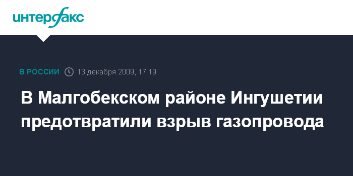 Назрань. 13 декабря. INTERFAX.RU - В Малгобекском районе Ингушетии под газопроводом высокого давления "Тбилиси-Моздок" в воскресенье вечером обнаружено взрывное устройство, сообщили агентству "Интерфакс-Юг" в МВД республики. "В настоящее время на месте работают саперы и взрывотехники. Проводится разминирование взрывного устройства", - сказал агентству представитель МВД Ингушетии. Вся прилегающая территория оцеплена.