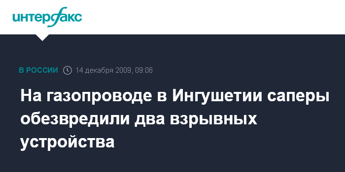 Москва. 14 декабря. INTERFAX.RU - На заминированном участке газопровода Тбилиси-Моздок Малгобекского района Ингушетии саперам удалось обезвредить два взрывных устройства, сообщил "Интерфаксу" представитель пресс-службы УФСБ по Ингушетии.