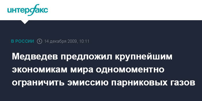 Москва. 14 декабря. INTERFAX.RU - Президент РФ Дмитрий Медведев призвал крупнейшие экономики мира "одномоментно принять на себя" необходимые обязательства, касающиеся эмиссии парниковых газов, и неукоснительно их соблюдать.