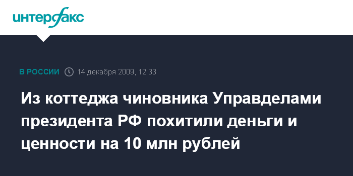 Москва. 14 декабря. INTERFAX.RU - В воскресенье вечером из коттеджа, принадлежащего начальнику Главного управления жилищного и социально-бытового обеспечения Управления делами президента РФ, похитили деньги и ценности на сумму около 10 млн рублей, сообщил "Интерфаксу" источник в правоохранительных органах региона.