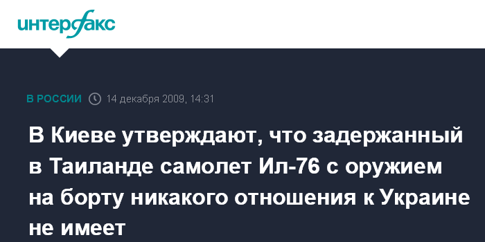 Москва. 14 декабря. INTERFAX.RU – Задержанный властями Таиланда самолет Ил-76 с партией оружия на борту не имеет отношения к Украине, заявляют в украинском министерстве транспорта и связи.
