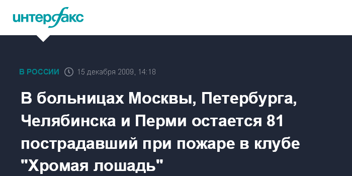 Москва. 15 декабря. INTERFAX.RU - В больницах остается 81 пострадавший при пожаре в Перми, большинство из которых в тяжелом и крайне тяжелом состоянии, сообщает Минздравсоцразвития.