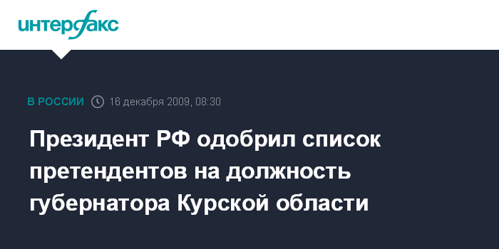 Москва. 16 декабря. INTERFAX.RU - Президент Российской Федерации Дмитрий Медведев согласился со списком кандидатур, предложенных партией "Единая Россия" на должность губернатора Курской области, сообщает в среду пресс-служба Кремля. Президентом будет внесено в Законодательное Собрание Курской области представление о кандидатуре губернатора Курской области из числа лиц, предложенных Президиумом Генерального совета "Единой России" (Акимов М.А., Зубарев А.С., Михайлов А.Н.).