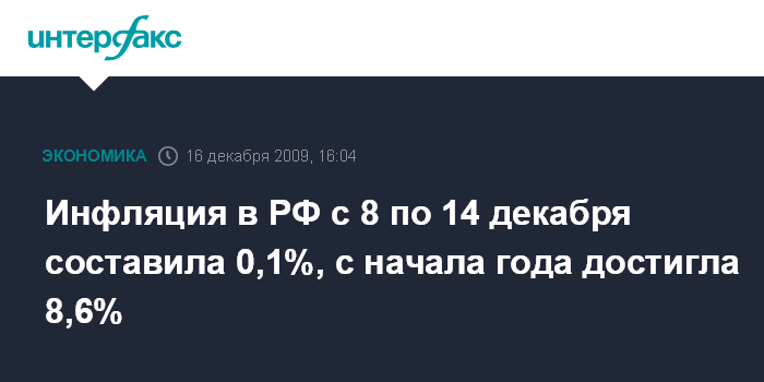 С начала декабря инфляция составила 0,2%, с начала года - 8,6%. В 2008 году с начала месяца рост цен был равен 0,3%, с начала года - 12,9%, в целом за декабрь прошлого года инфляция равнялась 0,7%.