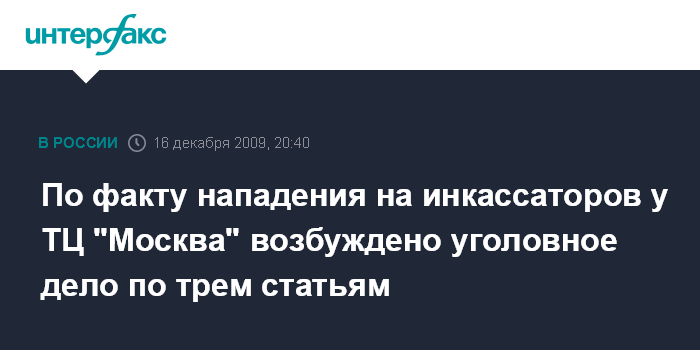 Москва. 16 декабря. INTERFAX.RU – В результате нападения на инкассаторов в Москве двое из них погибли, возбуждено уголовное дело по трем статьям: убийство, разбой и незаконный оборот оружия, сообщили "Интерфаксу" в СКП РФ.