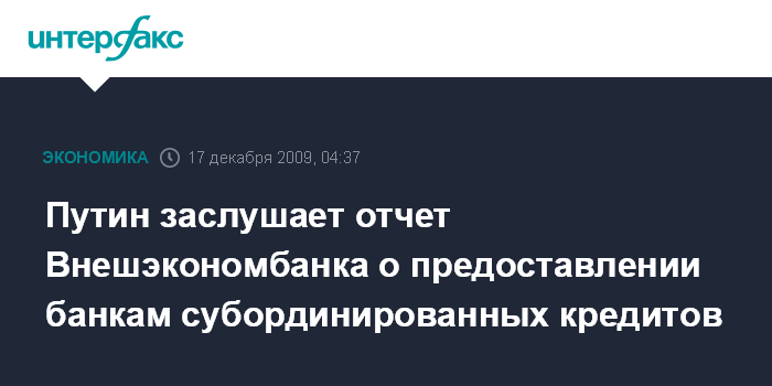 Путин заслушает отчет Внешэкономбанка о предоставлении банкам субординированных кредитов