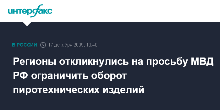 Москва. 17 декабря. INTERFAX.RU – МВД РФ обратилось к регионам с поручением ограничить оборот пиротехнических изделий, субъекты Федерации откликнулись на эту просьбу, сообщил в четверг на заседании правительственной комиссии по профилактике правонарушений ее секретарь Виталий Полунин.