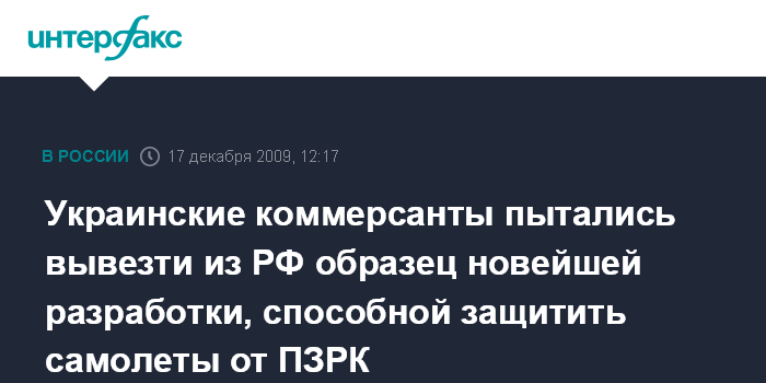 Москва. 17 декабря. INTERFAX.RU – Сотрудники украинской фирмы пытались незаконно вывезти из России техническую документацию и образец уникальной разработки, которая способна защитить самолеты от поражения переносными зенитно-ракетными комплексами (ПЗРК).