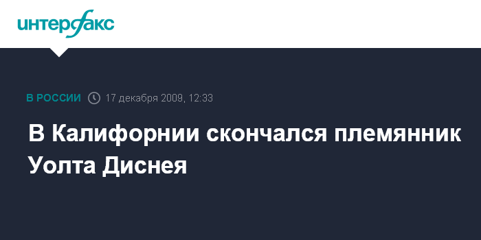 Москва. 17 декабря. INTERFAX.RU – Рой Эдвард Дисней, племянник основателя знаменитой мультипликационной студии Уолта Диснея, скончался в возрасте 79 лет, сообщает американская телекомпания "Си-Эн-Эн" со ссылкой на представителя компании.