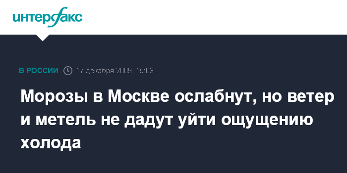Москва. 17 декабря. INTERFAX.RU - Двадцатиградусные морозы, установившиеся в Московском регионе и соседних областях, отступят уже в выходные, однако на смену им придут сильный ветер и снег, сообщил директор Гидрометцентра России Роман Вильфанд. "Мы ожидаем, что к воскресенью произойдет ослабление морозов. Уже с завтрашнего дня начнется постепенное повышение температуры на пару градусов", - сказал Р.Вильфанд "Интерфаксу" в четверг.