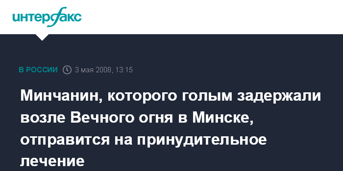 Минск. 3 мая. INTERFAX.RU - Психиатры признали невменяемым 19- летнего минчанина, которого голым задержали возле Вечного огня на площади Победы в Минске, сообщил "Интерфаксу" в субботу начальник предварительного расследования Партизанского РУВД Минска Юрий Кухор.