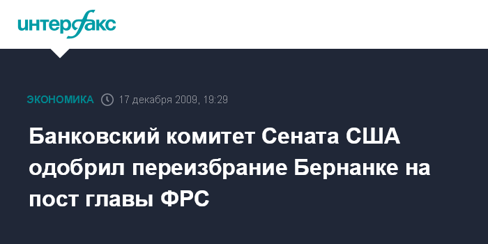 Москва. 17 декабря. INTERFAX.RU - Банковский комитет Сената США одобрил переизбрание Бена Бернанке на пост главы Федеральной резервной системы (ФРС) на второй срок, сообщило агентство Bloomberg. В ходе голосования кандидатура Б.Бернанке получила 16 голосов "за" и 7 голосов "против".