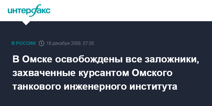 Омск. 18 декабря. ИНТЕРФАКС-СИБИРЬ - В Омске освобождены все заложники, захваченные курсантом Омского танкового инженерного института, - сообщили агентству "Интерфакс-Сибирь" в пресс-службе УВД по омской области.