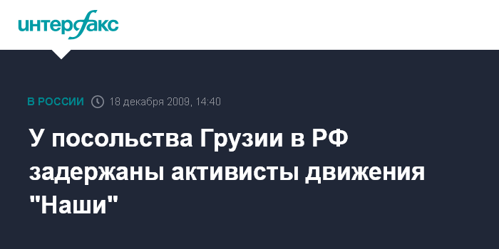 Москва. 18 декабря. INTERFAX.RU - Более 15 активистов молодежного движения "Наши" задержаны у посольства Грузии в Москве во время акции протеста против сноса Мемориала Славы погибшим в Великой Отечественной войне. "Около 50 активистов движения пришли в пятницу к посольству Грузии в центре Москвы, требуя остановить снос Мемориала в Кутаиси", - сообщила "Интерфаксу" пресс-секретарь движения "Наши" Кристина Потупчик. По ее словам, в руках участники акции держали плакаты, на которых было написано: "Не забудем, не простим", "Требуем остановить снос памятника". По ее словам, в течение десяти минут после начала акции на место ее проведения приехали несколько нарядов с сотрудниками милиции. "Задержано 15 человек, которые доставлены в милицию, сейчас на них составляются протоколы об административных правонарушениях", - сказала она.