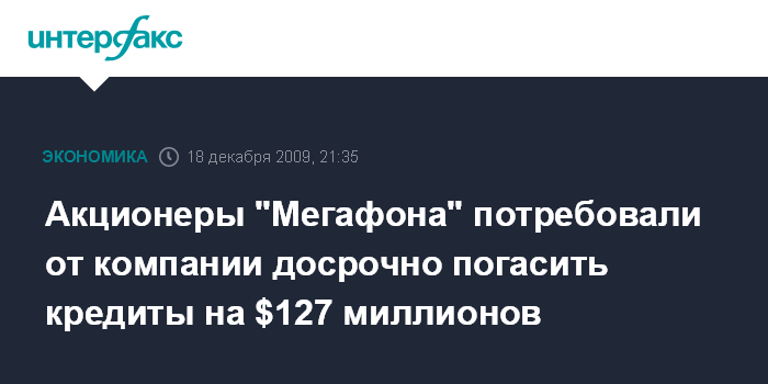 Москва. 18 декабря. INTERFAX.RU - Акционеры ОАО "Мегафон" в сентябре потребовали от компании досрочно погасить кредиты на общую сумму $127 млн, срок погашения которых по оригинальному графику наступал в 2011 году, говорится в материалах оператора.