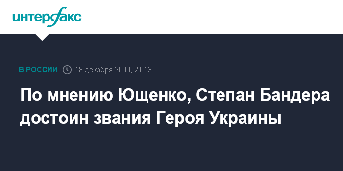 Москва. 18 декабря. INTERFAX.RU - Кандидат на пост президента Украины, действующий глава государства Виктор Ющенко считает, что лидер ОУН Степан Бандера достоин звания Героя Украины. Отвечая на вопрос избирателей в пятницу в Виннице, почему Бандере не присвоено звание Героя Украины, В.Ющенко сказал: "Еще не вечер". При этом он заметил, что "эта тема правильная". "Проблемы в этом я не вижу", - сказал украинский президент.
