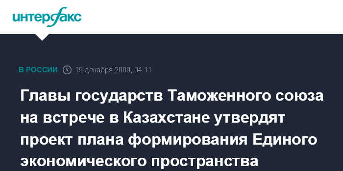 Главы государств Таможенного союза на встрече в Казахстане утвердят проект плана формирования Единого экономического пространства
