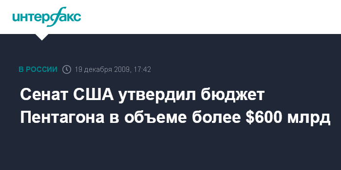 Москва. 19 декабря. INTERFAX.RU - Сенат США отправил президенту проект бюджета Пентагона на следующий финансовый год в размере $636 млрд, сообщает британская телерадиокорпорация Би-би-си.