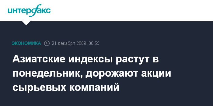 Москва. 21 декабря. INTERFAX.RU - Азиатские фондовые индексы растут в понедельник впервые за три торговых сессии благодаря подъему котировок акций сырьевых компаний, обусловленному повышением цен на нефть, медь и золото, сообщает агентство Bloomberg. Сводный индекс региона MSCI Asia Pacific увеличился в ходе торгов на 0,3%.