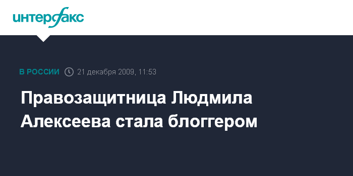 Москва. 21 декабря. INTERFAX.RU - Глава старейшей в России независимой правозащитной организации, Московской Хельсинкской группы, 82-летняя Людмила Алексеева завела свой блог в Интернете (http://lm-alexeeva.livejournal.com). "Собираюсь стать активным блоггером", - сказала она "Интерфаксу" в понедельник.