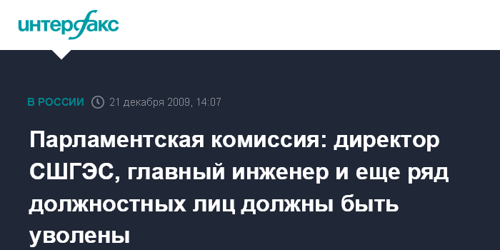 Москва. 21 декабря. INTERFAX.RU - Парламентская комиссия по расследованию аварии на Саяно-Шушенской ГЭС рекомендуют освободить от занимаемых должностей нескольких представителей руководства гидроэлектростанции, включая директора, главного инженера и начальника службы мониторинга оборудования.