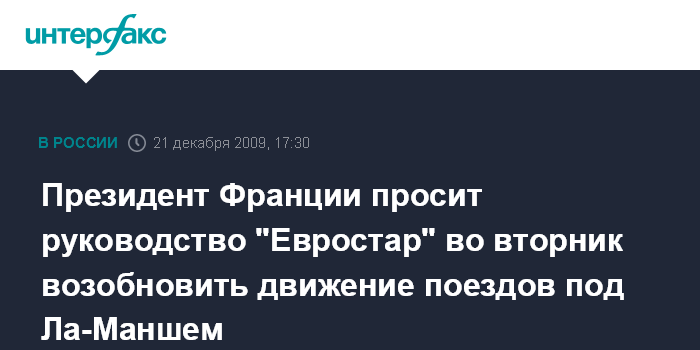 Москва. 21 декабря. INTERFAX.RU - Президент Франции Николя Саркози обратился с просьбой к руководителям компании "Евростар", чтобы они возобновили движение поездов по туннелю под Ла-Маншем уже во вторник 22 декабря, сообщило в понедельник агентство ЭФЭ.