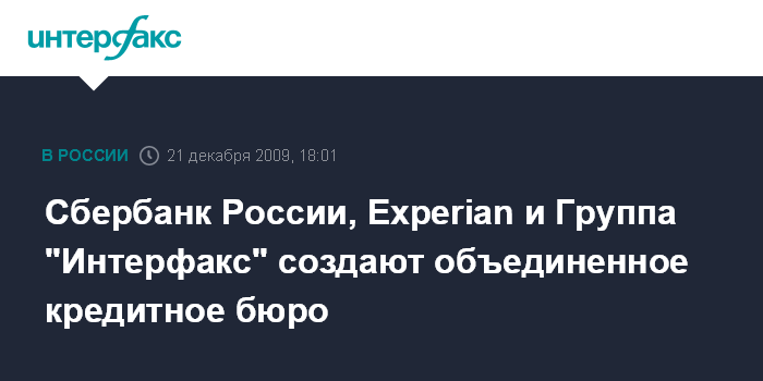 Москва. 21 декабря. INTERFAX.RU - Сбербанк России, компания Experian и Международная информационная Группа "Интерфакс" объявляют о создании объединенного кредитного бюро, которое позволит повысить прозрачность российского рынка потребительского кредитования, доступность кредитов для граждан, а также снизить риски для банков.