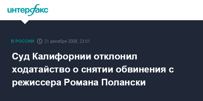 Вашингтон. 21 декабря. ИНТЕРФАКС - Апелляционный суд Калифорнии отклонил ходатайство адвокатов французского режиссера польского происхождения Романа Полански о прекращении дела, по которому режиссер обвиняется в сексуальной связи с несовершеннолетней, имевшей место в 1977 году, сообщают местные СМИ.