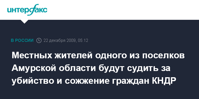 Благовещенск. 22 декабря. ИНТЕРФАКС - ДАЛЬНИЙ ВОСТОК - Заместитель прокурора Амурской области направил в суд уголовное дело в отношении пятерых жителей поселка Стойба, которые по версии следствия убили и сожгли двоих корейцев.